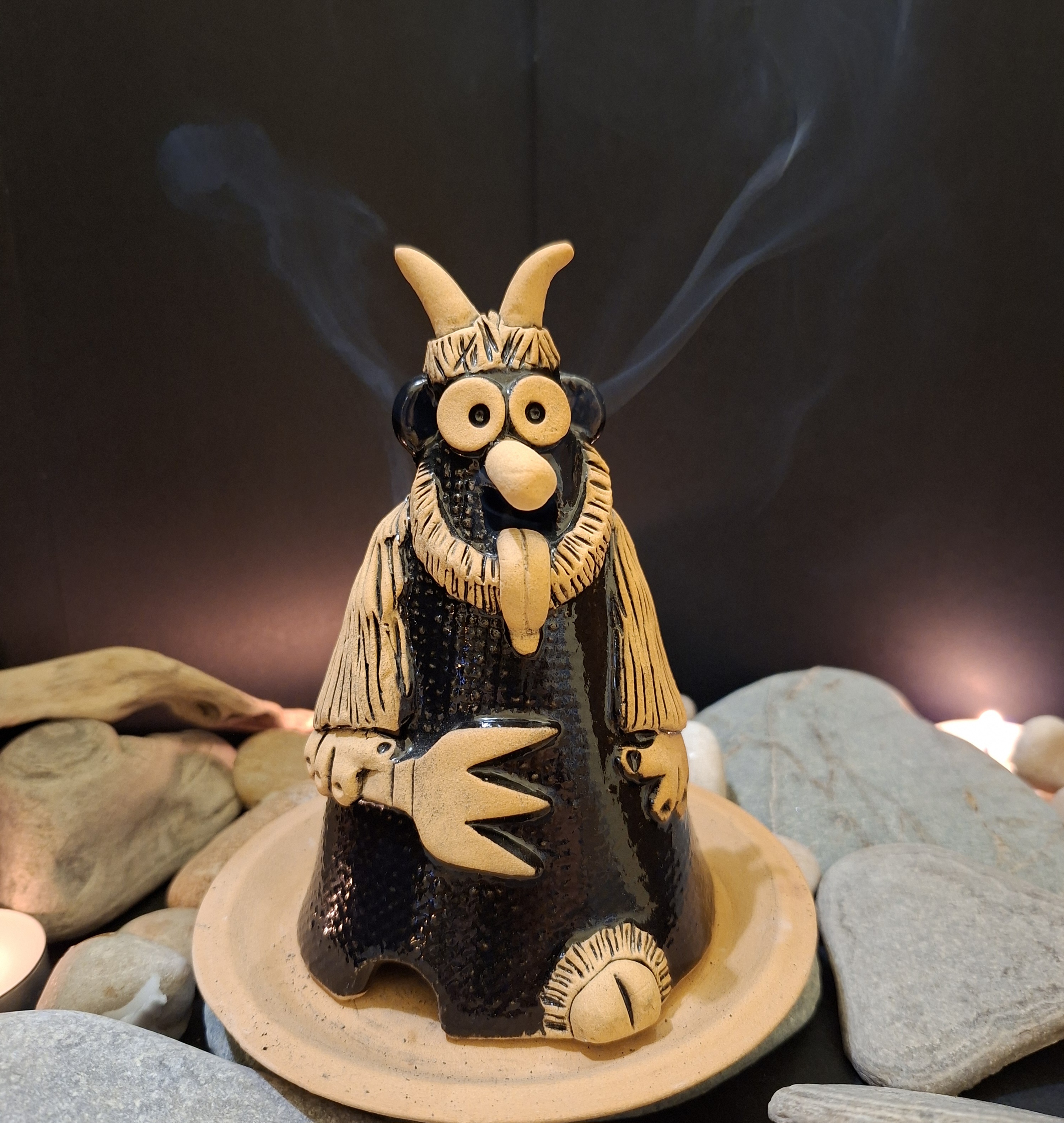Keramická dekorace. Určeno k použití na vonné kužely "františky". Po zapálení františka se čertíkovi kouří z uší a z nosu.