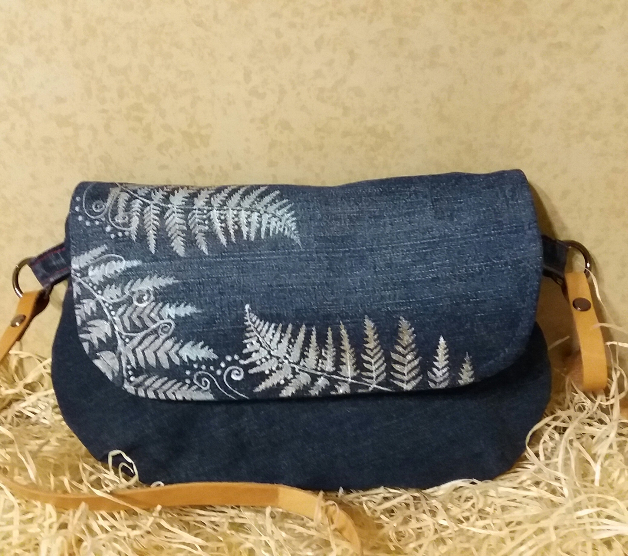 Džínová kabelka s ručně malovanou klopou. Malba je tepelně zafixovaná. Kabelka je vyztužená a podšitá. Uvnitř je našitá dvojitá kapsa. Kožený popruh je odepínací s karabinami, délka 120 cm. Kabelku nedoporučuji prát v pračce ani sušit v sušičce. Případné znečištění odstraňte navlhčenou houbičkou s mýdlem a nechte volně uschnout.