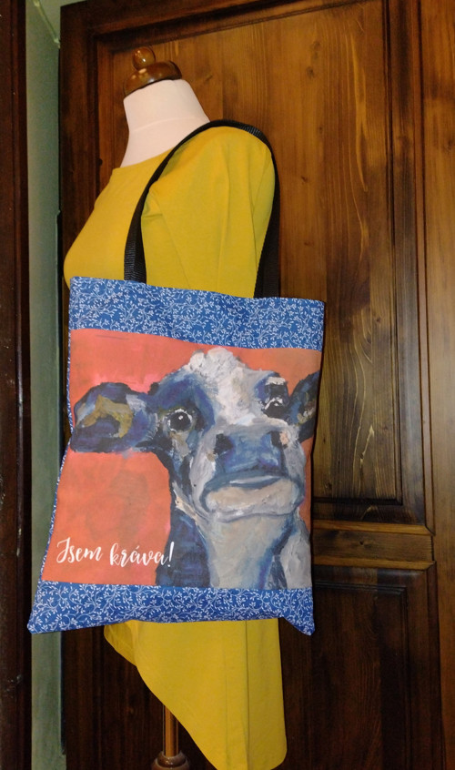 Originální tisk na plátno autorské malby Petry Urbanové. Originál, jinde nekoupíte. Pevná taška přes rameno. Přední strana je s motivem krávy, zadní strana je tmavě modrá s jemným vzorem. Ušitá je z bavlněného materiálu s digitálním tiskem. Vnitřní strana je s podšívkou. Popruhy jsou dlouhé 60 cm k nošení přes rameno.