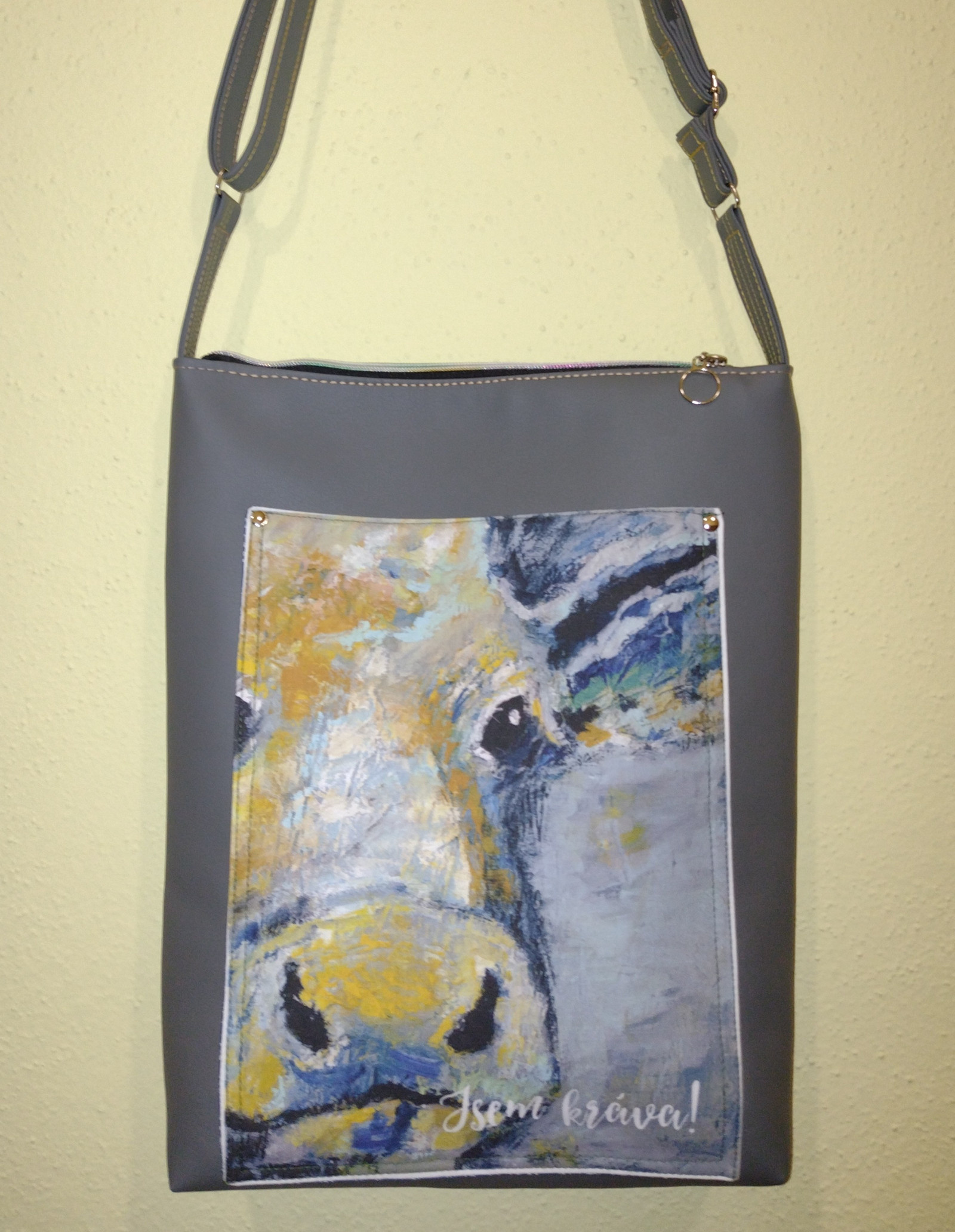Originální tisk na plátno autorské malby Petry Urbanové. Originál, který jinde nekoupíte. Pevná taška přes rameno. Přední strana má našitou velkou kapsu s motivem krávy ve velikosti 22 x 30cm. Taška je ušitá z koženky a z bavlněného materiálu s digitálním tiskem. Vnitřní strana je s podšívkou a velkou našitou kapsou. Popruh je nastavitelný, dlouhý až 140 cm k nošení přes rameno i křížem přes tělo.