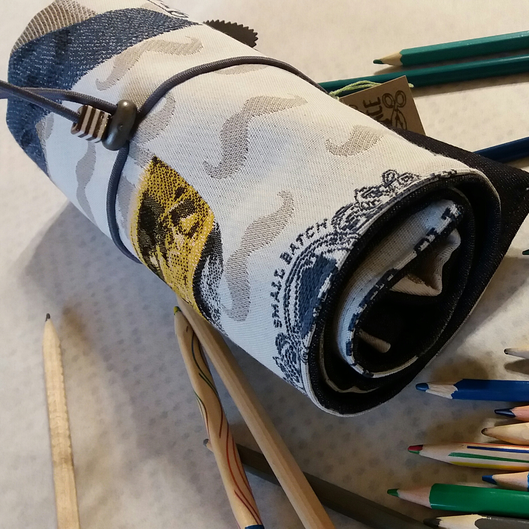 Tužkovník ušitý z pevné látky, vyztužený. Obsah je na 30 nebo 45 pastelek. Případně na silné pastelky. Našitá je výklopná kapsa na drobnosti 15x8cm. Zavazování na tkaničky. Špičky pastelek májí výklopný chránič - klopu.