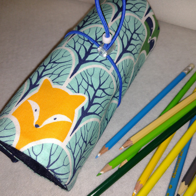 Tužkovník ušitý z pevné látky a vyztužený. Obsah je na 30 pastelek. Našitá je výklopná kapsa na drobnosti 15 x 8cm. Zavazování na gumu.