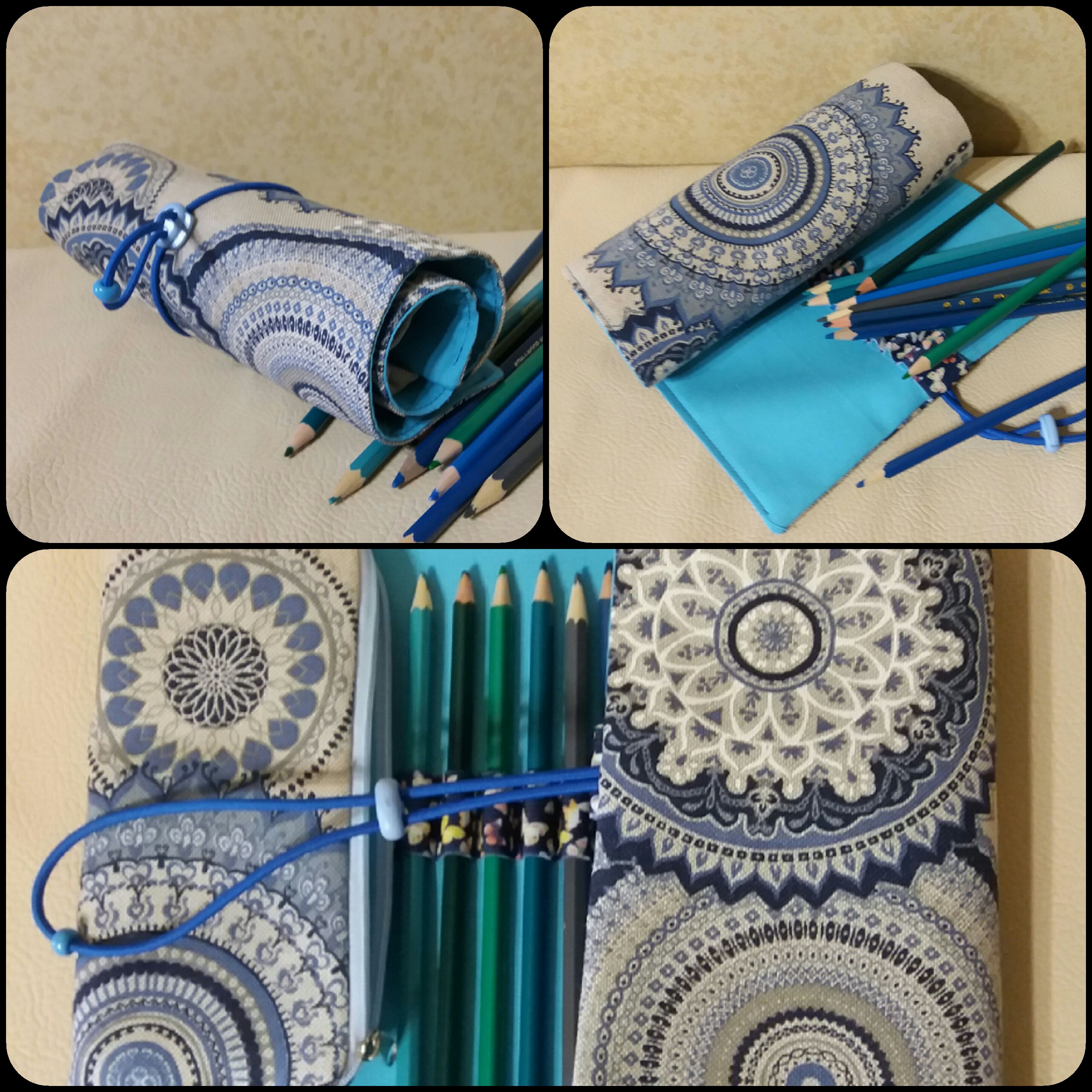 Tužkovník ušitý z pevné látky, vyztužený. Obsah je na 30 pastelek. Našitá je výklopná kapsa na drobnosti 15x8cm. Zavazování na gumu. Špičky pastelek mají výklopný chránič - klopu.