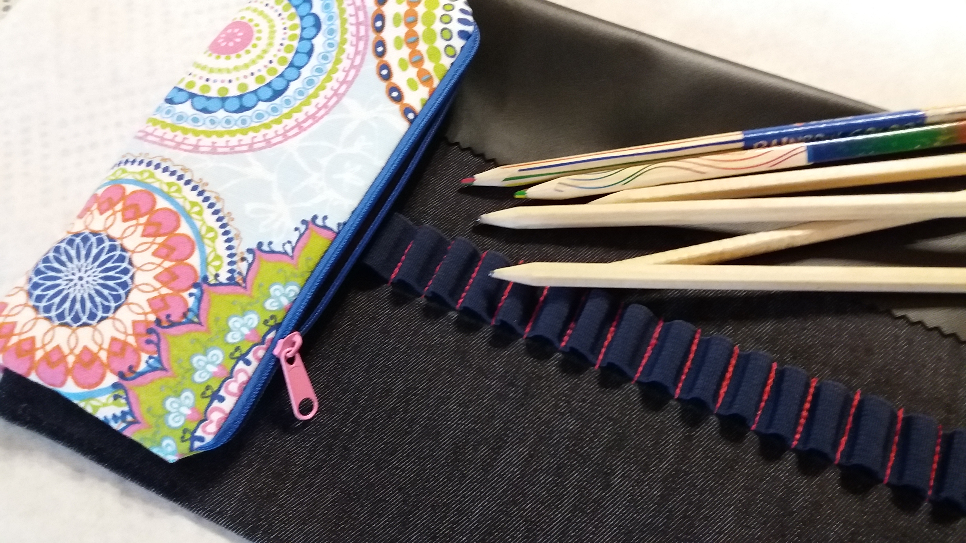 Tužkovník ušitý z pevné bavlněné látky, vyztužený. Našitá je výklopná kapsa na drobnosti 14 x 8cm. Zavazování na gumu s brzdičkou.