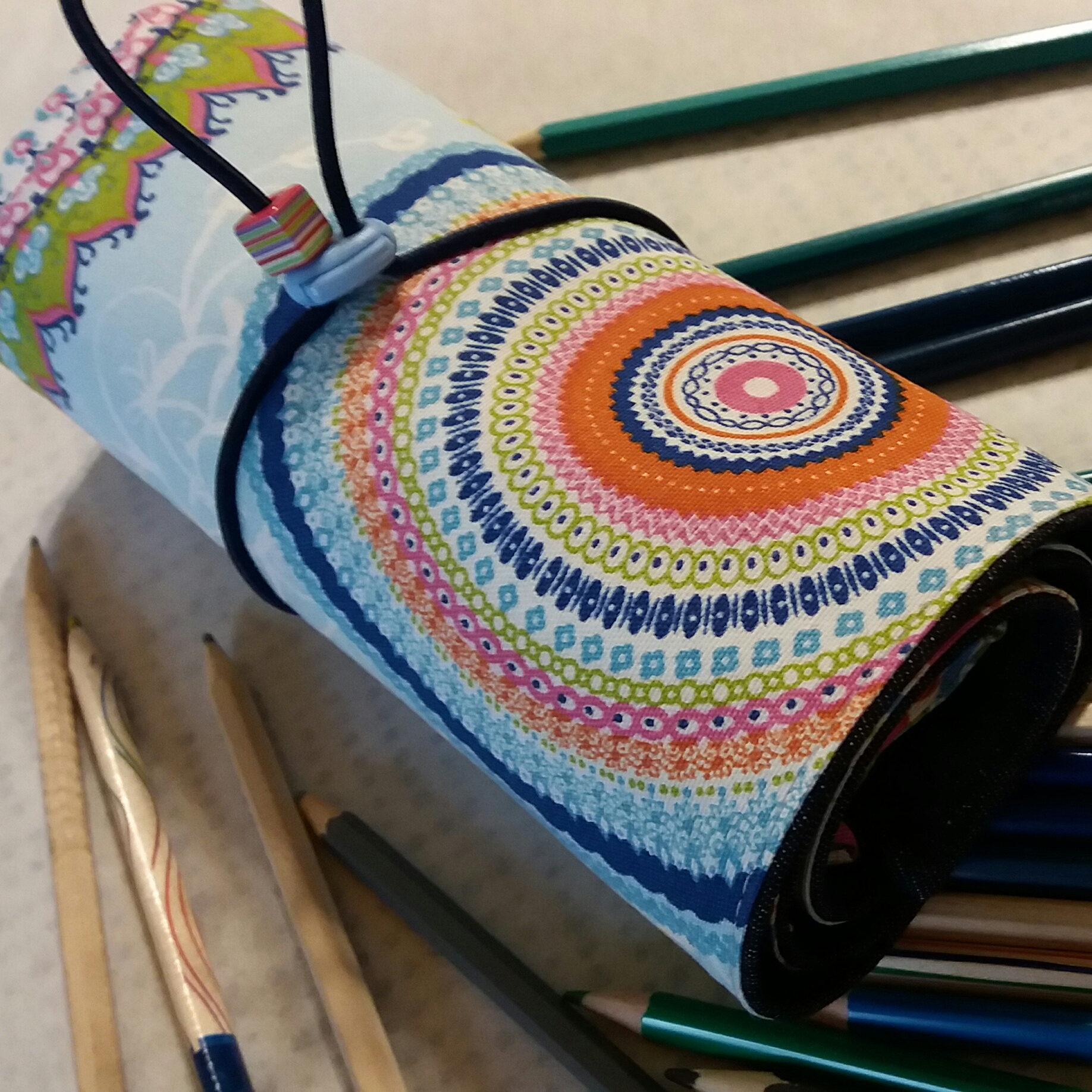 Tužkovník ušitý z pevné bavlněné látky, vyztužený. Našitá je výklopná kapsa na drobnosti 14 x 8cm. Zavazování na gumu s brzdičkou.