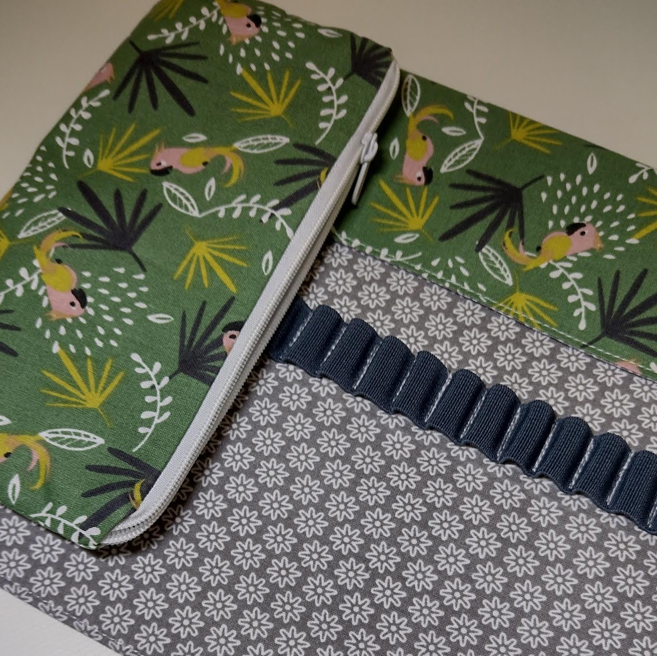 Tužkovník ušitý z pevné bavlněné látky, vyztužený. Našitá je výklopná kapsa na drobnosti 14 x 8cm. Zavazování na gumu s brzdičkou.