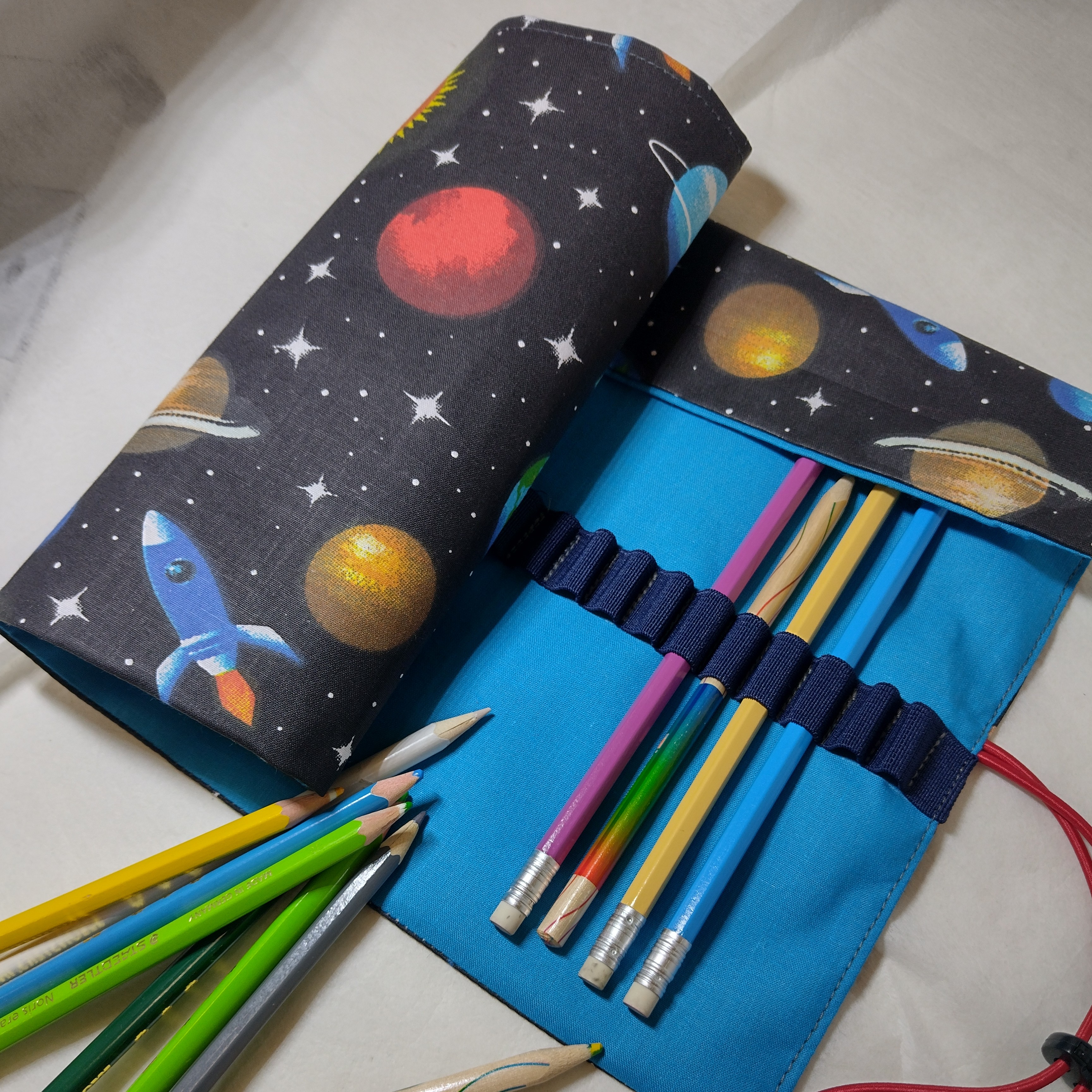 Tužkovník ušitý z pevné bavlněné látky, vyztužený. Našitá je výklopná kapsa na drobnosti 14 x 8cm. Zavazování na gumu s brzdičkou.