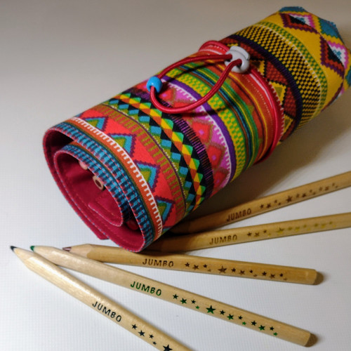 Tužkovník ušitý z pevné bavlněné látky, vyztužený. Obsah je na slabé pastelky. Zapínání na kulatou gumu s brzdou. Součástí je kapsička na příslušenství ( š 15 cm, výška 10 cm ) - guma, ořezávátko, malé pravítko. Špičky pastelek mají klopu, která chrání pastelky ve srolovaném stavu před vypadnutím nebo polámáním.
