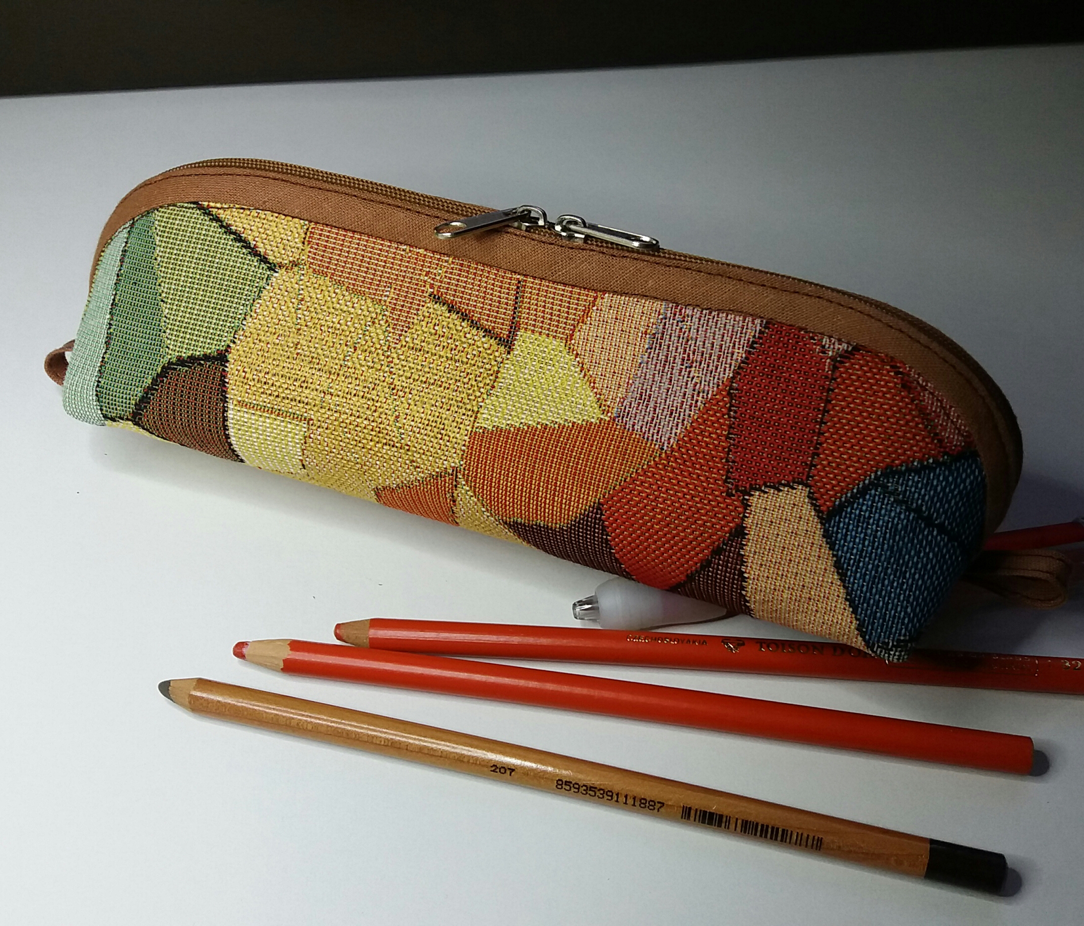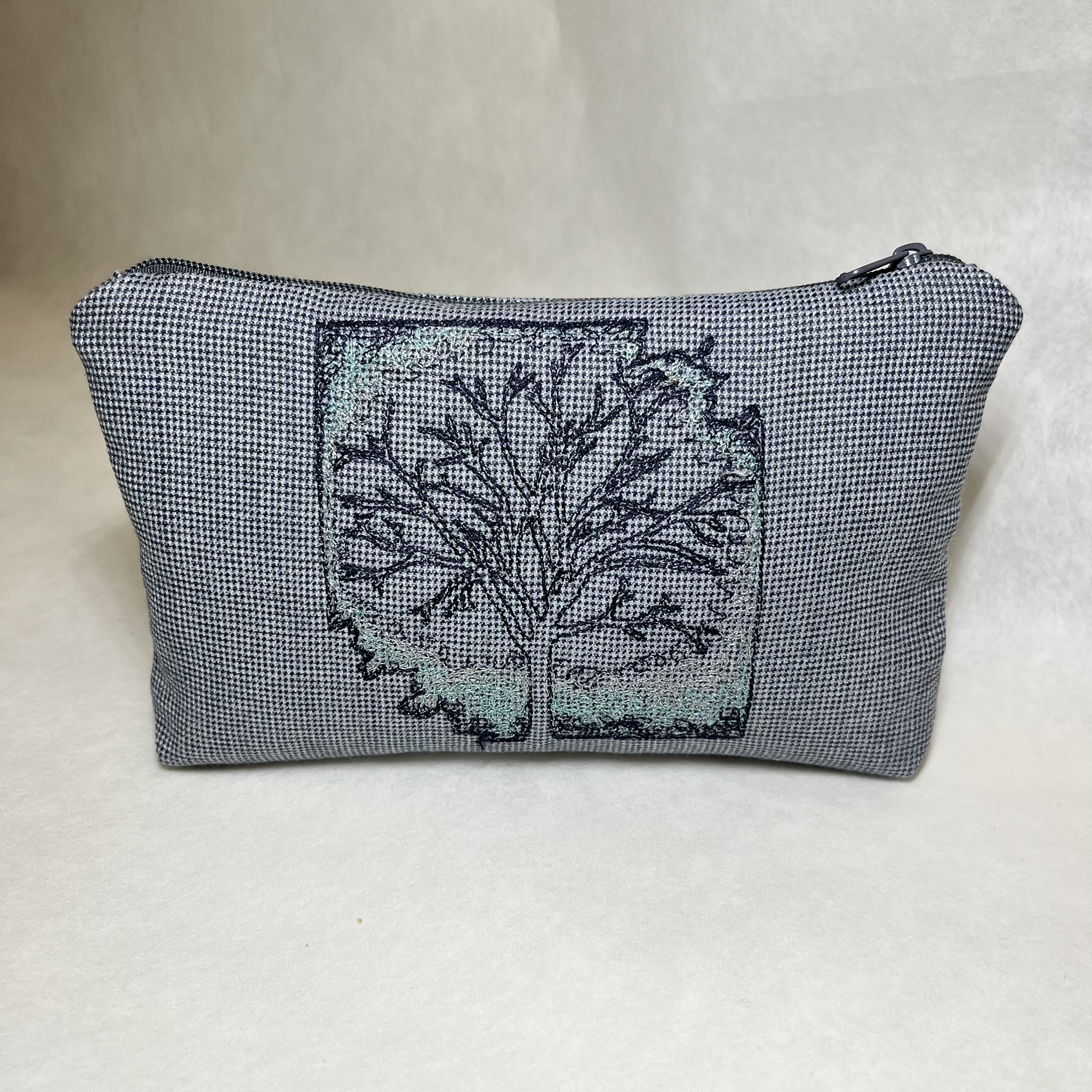 Taštička je ušitá z čalounických látek, zdobená strojní výšivkou. Užijete ji jako malý organizér do kabelky na tajné poklady. Rozměr: šíře 18 cm, výška 11 cm.